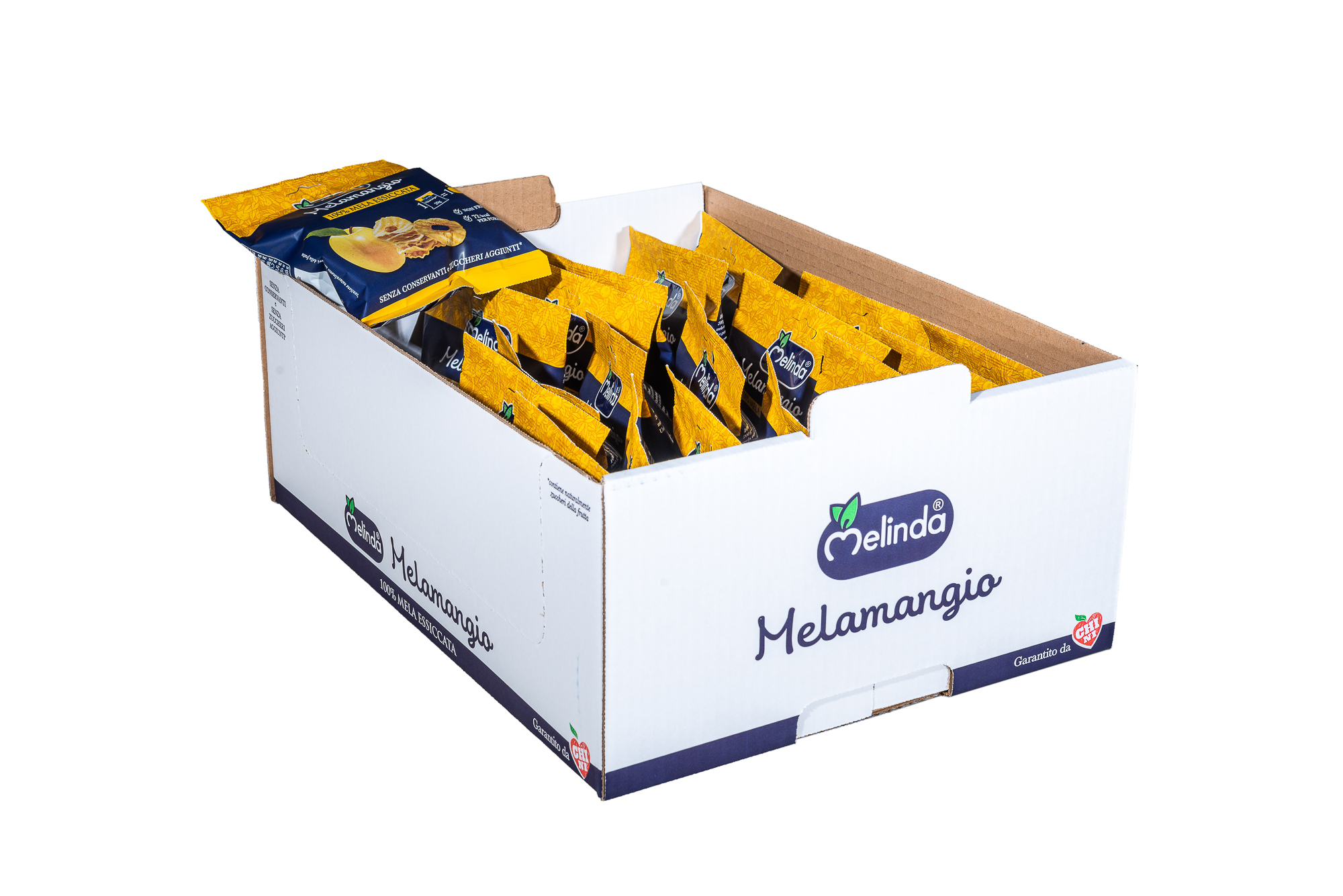 una scorta di snack monoporzione sani e sfiziosi: 100% mele Melinda, senza conservanti, zuccheri aggiunti, grassi.
