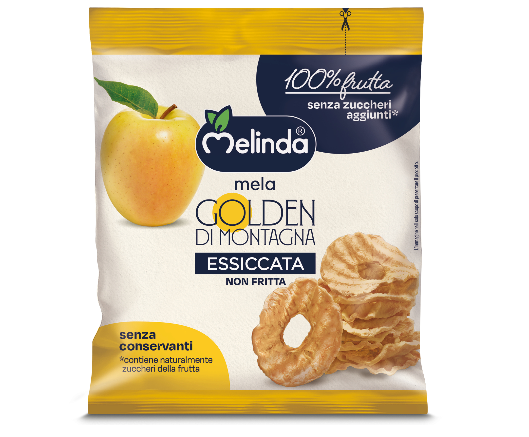 uno snack monoporzione sano e sfizioso: 100% mele Melinda, senza conservanti, zuccheri aggiunti, grassi.