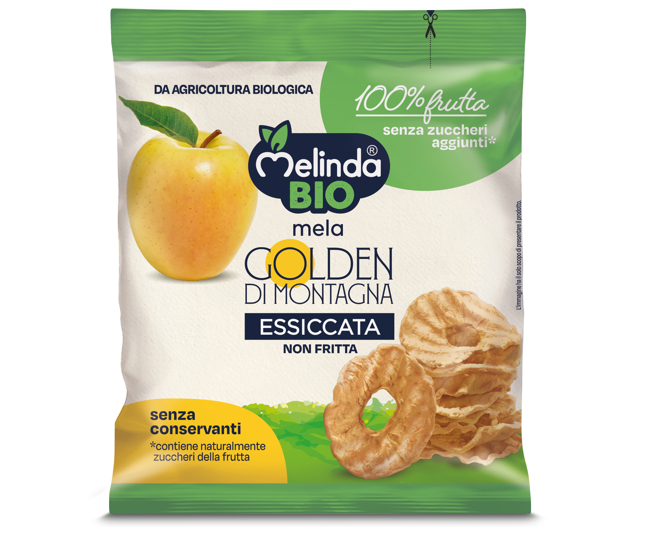 croccanti rondelle di mele Golden Delicious Melinda biologiche essiccate, senza semi e buccia, in busta monoporzione.