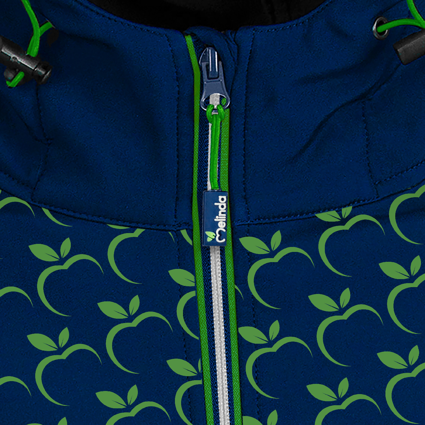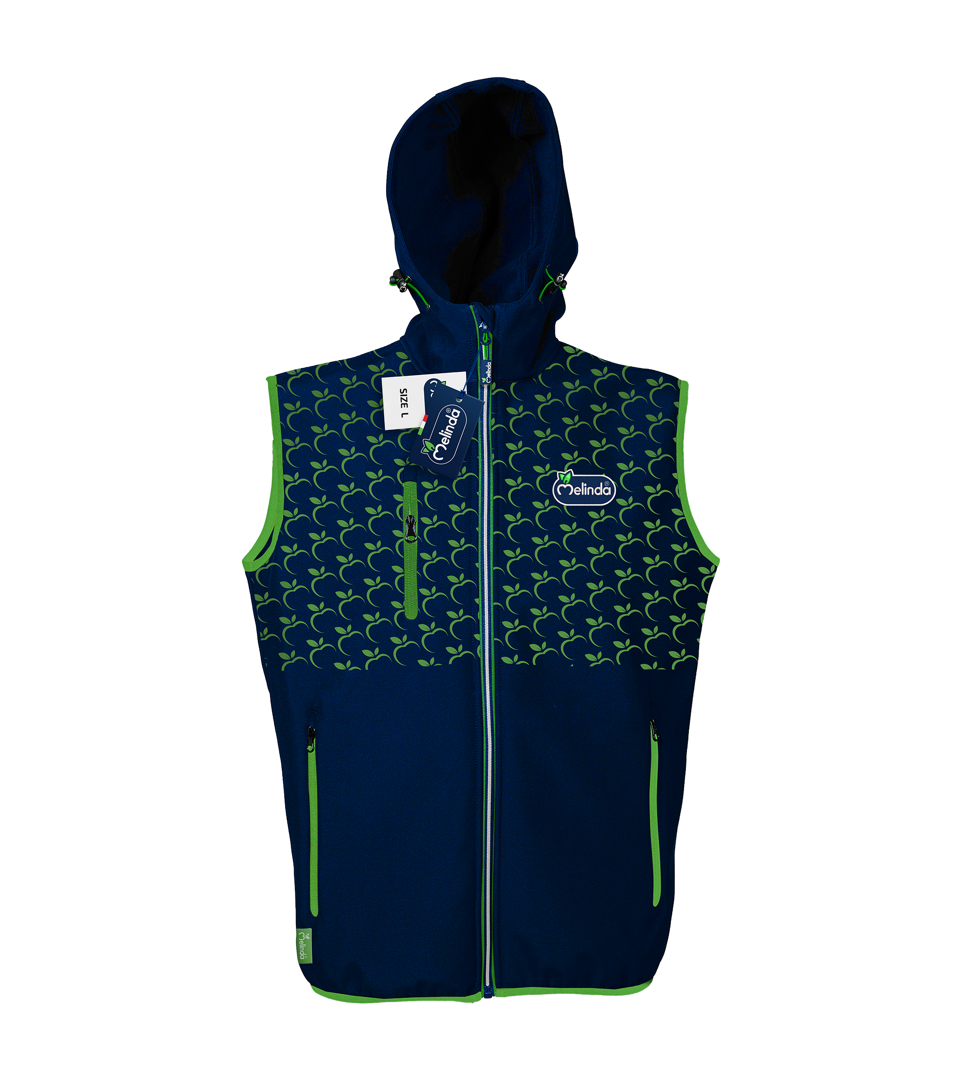 Il gilet interamente personalizzata Melinda, con applicazioni di bande rifrangenti a forma di mela.